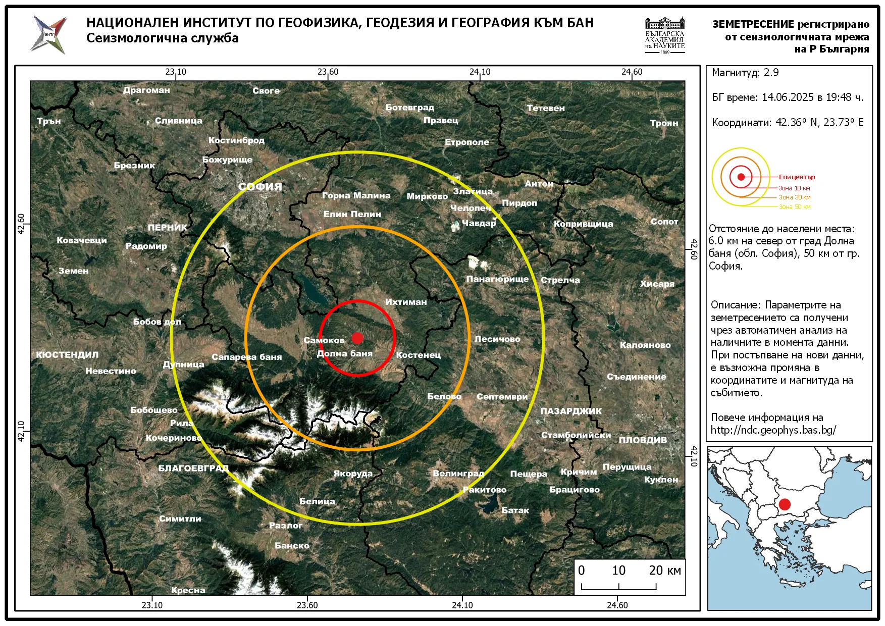 Земетресение с магнитуд 2.9 е записано в региона на град Долна баня, област София.