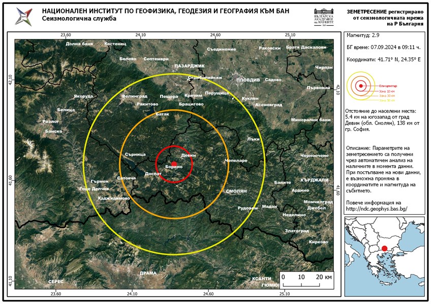 Земетресение с магнитуд 2.9 по Рихтер е записано в региона на град Девин на през днешния ден в 09:11 часа българско време.