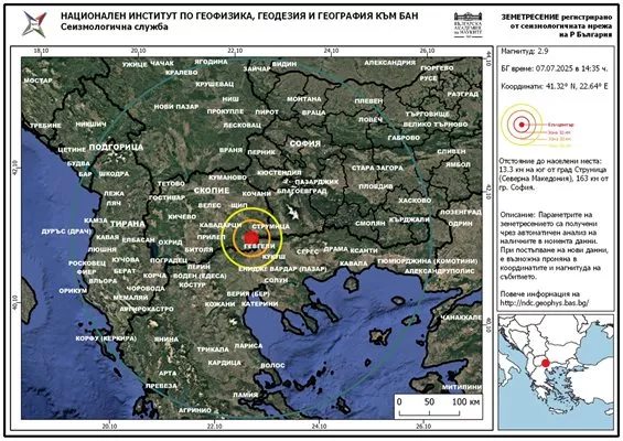Земетресение с магнитуд 2,9 по скалата на Рихтер е било записано в 14:35 ч. българско време в Северна Македония, оповестиха от Националния институт по геофизика, геодезия и география към Българска академия на науките.