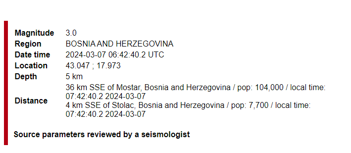 Земетресение с магнитуд 3,1 по скалата на Рихтер е записано в Босна и Херцеговина в 06.42 ч. Трусът е с дълбочина девет километра, съгласно Европейско-средиземноморския сеизмологичен център. Епицентърът е бил на 29 км от град Мостар. Няма данни за нанесени материални вреди.