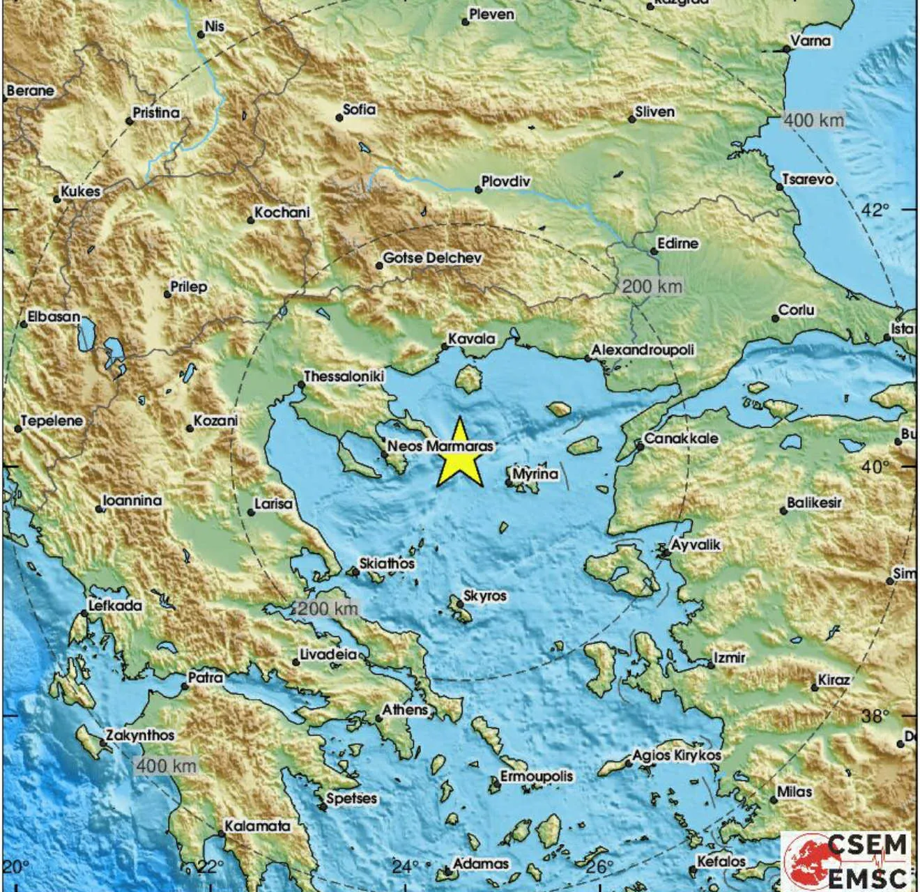 Земетресение с магнитуд 3.8 по скалата на Рихтер е записано през днешния ден, 19 юни 2025 година, в 13:54 ч. локално време (10:54 UTC), в северната част на Егейско море. Данните са оповестени от сеизмологична платформа, която регистрира, че трусът е с дълбочина от 8 км и епицентър на 49 км западно-северозападно от гръцкия остров Мирина, както и на 151 км източно-югоизточно от Солун.