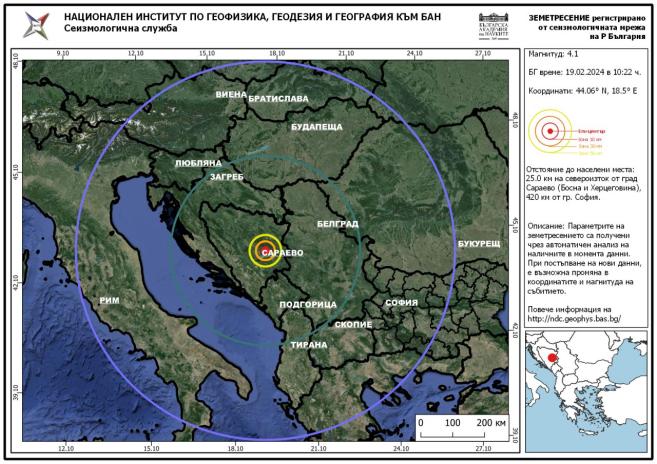 Трусът е регистриран на 25 километра североизточно от Сараево с дълбочина 5 км, сочат още данните на НИГГГ.