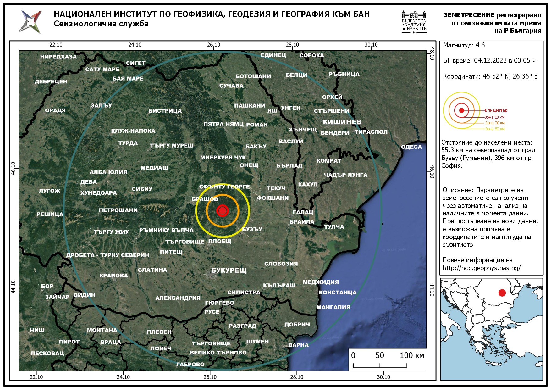 Земетресение с магнитуд 4.6 е записано наоколо до град Бузъу, Румъния, сеизмогенна зона Вранча през днешния ден, 4 декември.