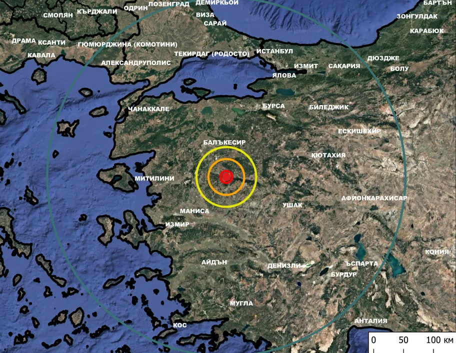Епицентърът на труса е бил на към 64 километра югоизточно от град Балъкесир, Турция, и на към 574 километра от София.
