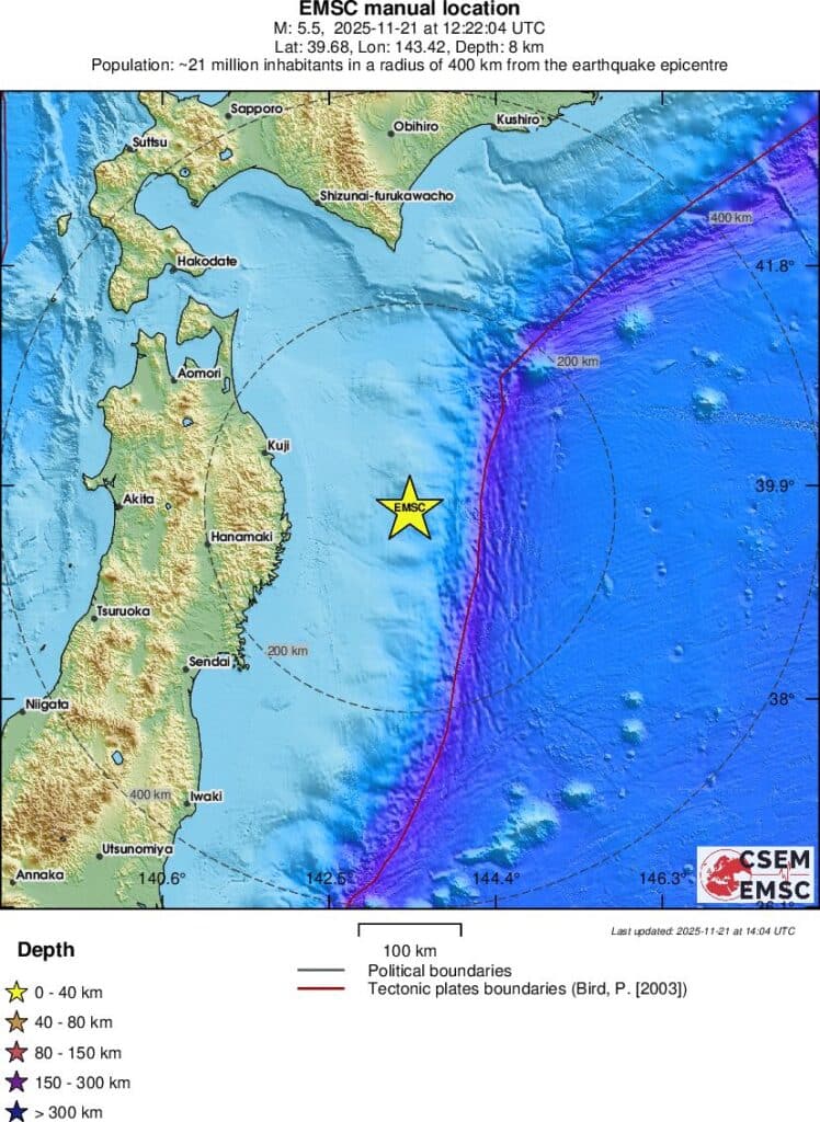 Земетресение с магнитуд 5,5 по Рихтер е регистрирано край източния бряг на най-големия японски остров Хоншу, демонстрира информация на формалната интернет страница на Европейския средиземноморски сеизмологичен център ().