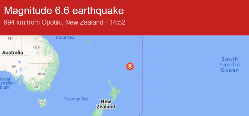 Земетресение с магнитуд 6,6 по Рихтер е записано в Тихия океан покрай архипелага Кермадек, част от Нова Зеландия.