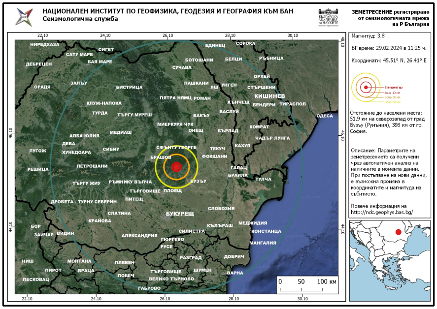 По данни на Националния Сеизмологичен Център към Национален Институт по Геофизика, Геодезия и География - Българска академия на науките, събитието от 29 февруари, от 11:25 часа българско време е с епицентър на 200 км от град Русе и на 400 км от град София.