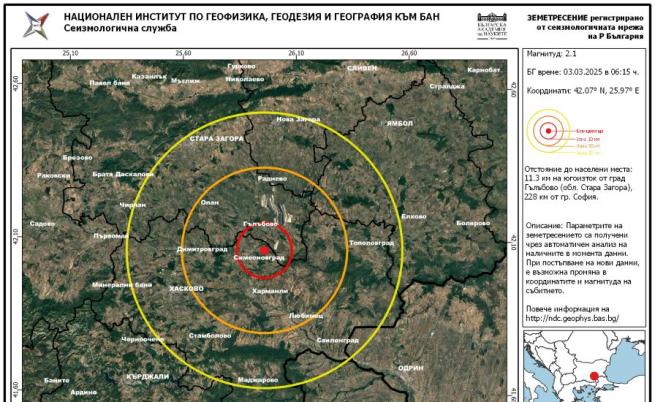 Земетресение с магнитуд от 2.1 по Скалата на Рихтер е станало сред Гълъбово и Симеоновград. Трусът е регистриран в 6:15 ч. Това сочат данните на Националния институт по геофизика, геодезия и география към Българска академия на науките.