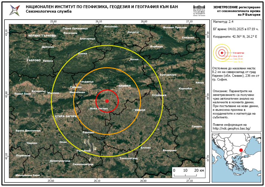 Епицентърът е сред градовете Нова Загора и Сливен и на 236 км от София.