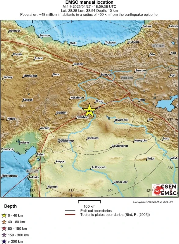 Земетресение с магнитуд от 4.9 по Рихтер е записано в Източна Турция, това демонстрира информация в уеб страницата на Европейския средиземноморски сеизмологичен център (EMSC).