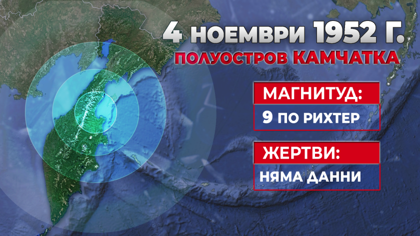 На 4 ноември 1952 година край източното крайбрежие на полуостров Камчатка са регистрирани серия от земетресения. Най-мощният от тях е с магнитуд 9 по Рихтер. Трусовете предизвикват голям брой цунамита, които нанасят провали по полуострова и Курилските острови и лишават човешки животи. Най-високите талази доближават 13 метра.