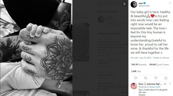 Бившият член на One Direction също разгласява новината в обществените мрежи. В Twitter той написа: " Любовта, която изпитвам към това малко дребосъче, е отвън усещанията ми. Щастлив съм, че я има, горделив да я нарека моя и признателен за живота, който ще споделим дружно! "