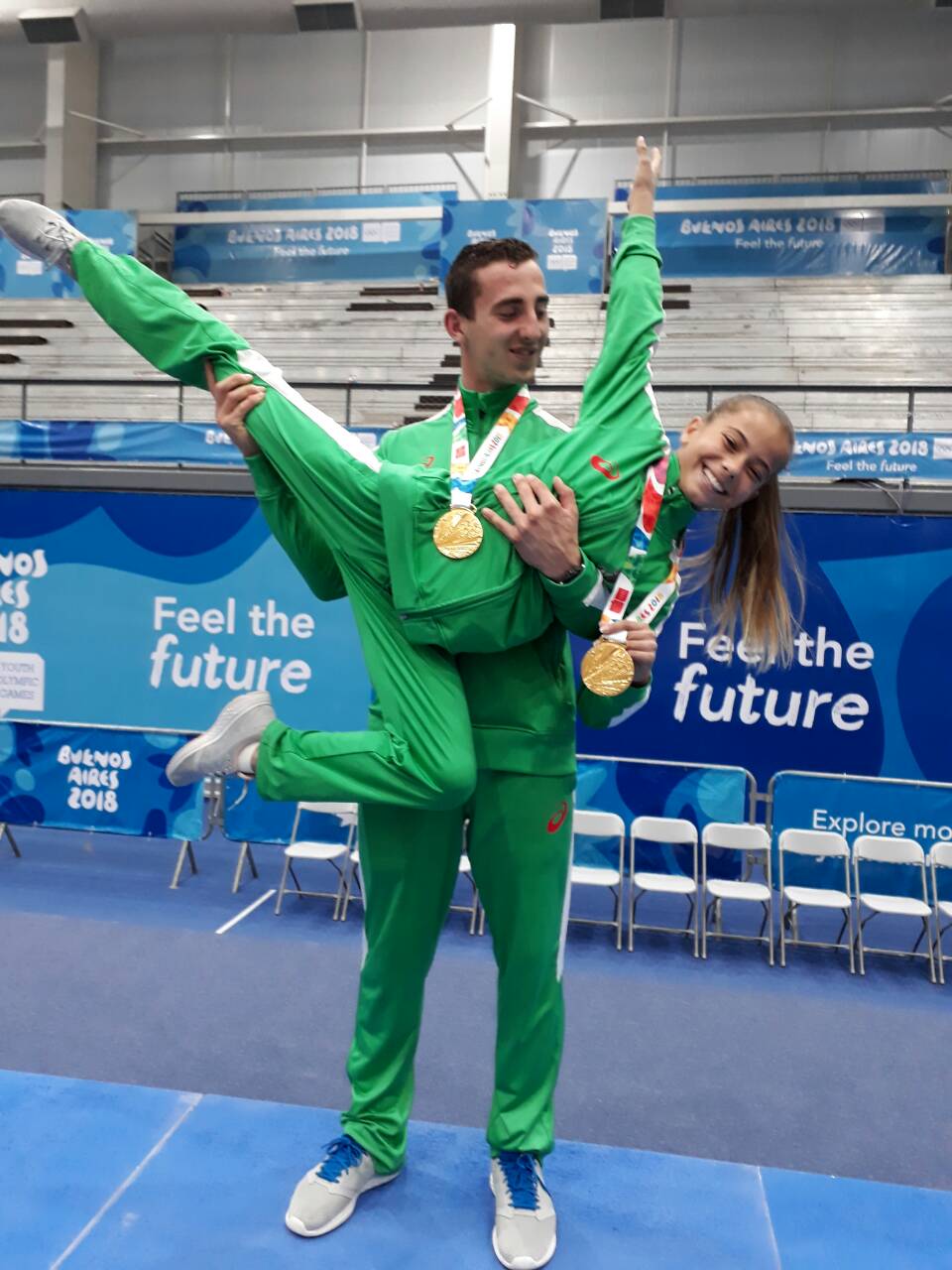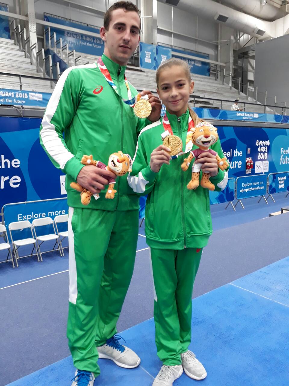 Златни медали за двамата представители в акробатиката на младежката олимпийски игри в Буенос Айрес. Мариела Костадинова и Панайот Димитров получиха доскоро скъпите си оценки като част от интернационалния тим спечелил първото място в мултинационалното гимнастическо съревнование на смесени тимове.