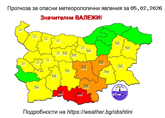 Значителни количества от дъжд и сняг се чакат през днешния ден в цялата страна, като в по-голямата част е оповестена заплаха от втора степен. Едновременно с това има области за които не е в действие предизвестие, а има и такива с оранжев и даже червен код. За област Пловдив е в действие жълт код, като в крайните южни региони на региона ще има обилни превалявания от дъжд с количества до 25-30 mm. Температурите ще се задържат позитивни, със стойности сред 3 и 7 градуса.