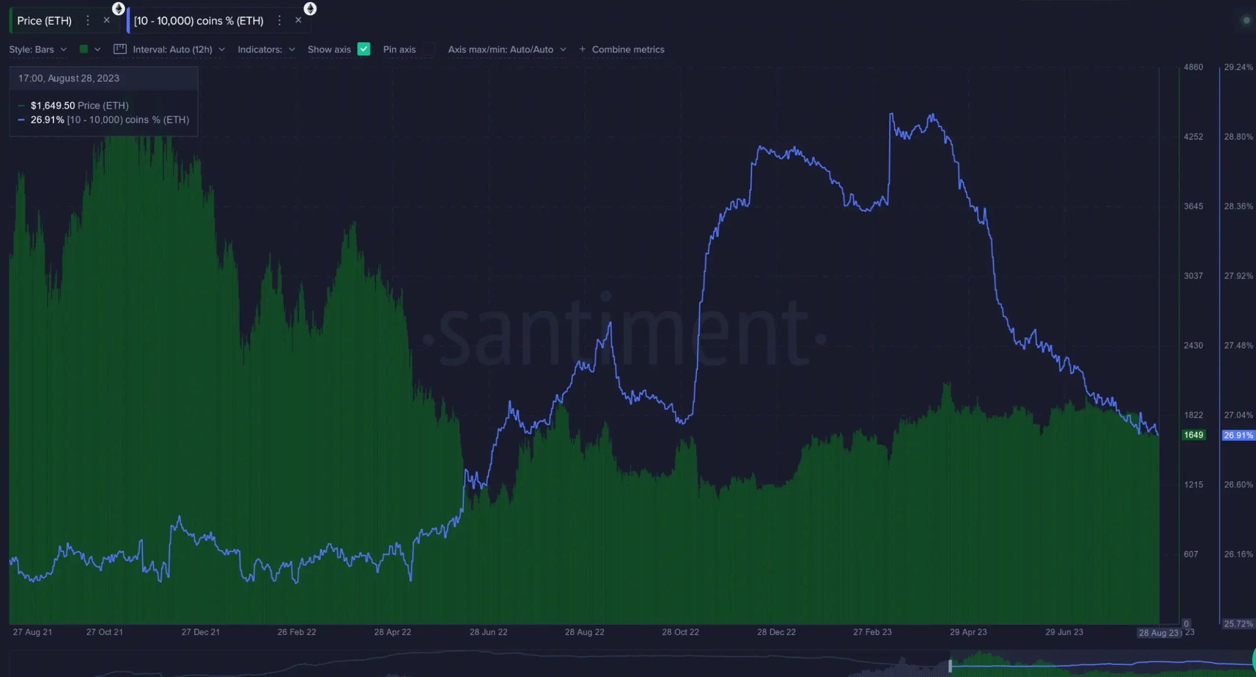 Брайън Куинливан, шеф по маркетинга на Santiment означи , че адресите с притежания от 10 до 10,000 ETH са минали към мечи настроения от април насам. Това е в внезапен контрастност с бичото им държание, следено през четвъртото тримесечие на 2022 година