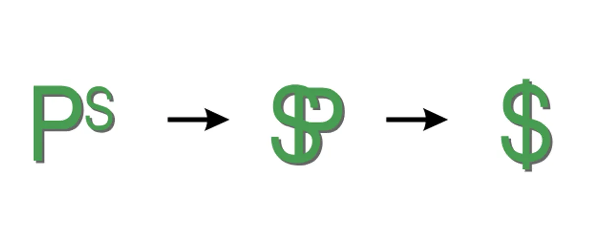 Песото нормално се е изписвало на стенографски език като Ps, което след това се сплотява в признака, при който P и S се припокриват в една форма, както се вижда на картинката. В последна сметка извивката на P отпада и остава единствено правата отвесна линия, образувайки познатия ни през днешния ден Щатски долар.