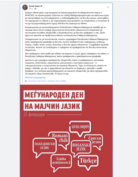 " Зоран Заев, в оповестената от Вас през вчерашния ден хумореска на никое място не се вижда езика на болшинството в Република Северна Македония. Защо по този начин? Защо настойчиво продължавате да подценявате и неглижирате съществуването на стотици хиляди македонски българи в страната, която прекръстихте на Република Северна Македония?