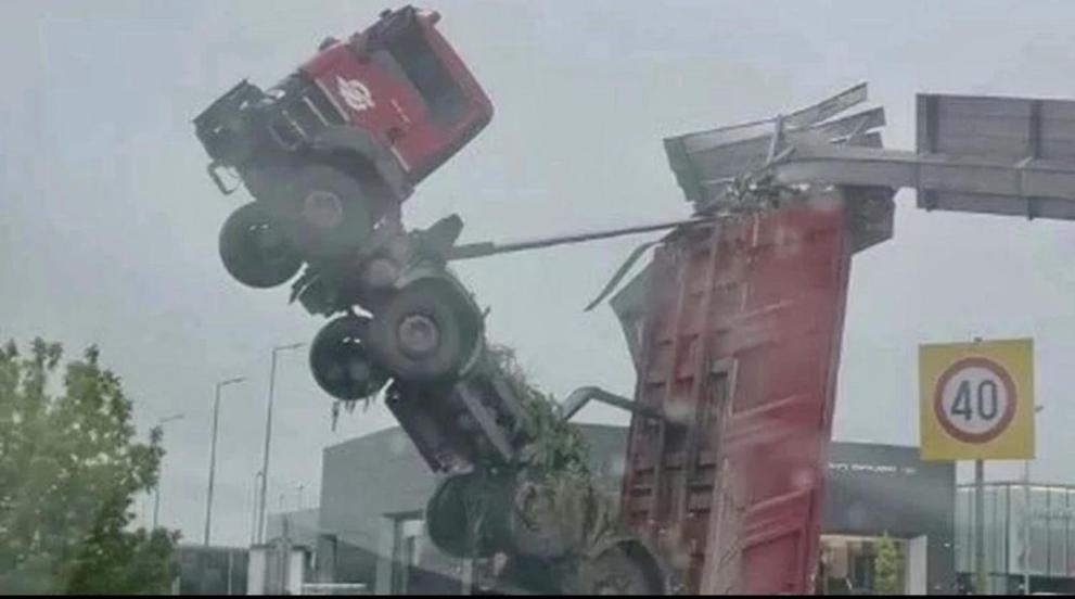 Превозното средство се е изправило единствено на задни гуми, а кабината на водача е на три метра в посока небето. По първични данни лидерът е не запомнил да смъкна вдигнатата каросерия , която при придвижване се е закачила за указателната табела и е провокирала удара.