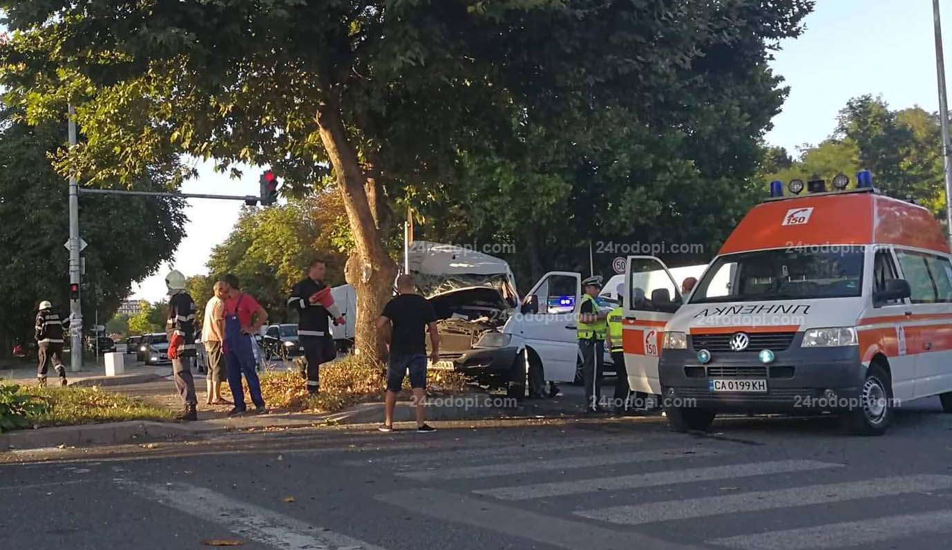 Зверска катастрофа! Водач заклещен след удар на бус в дърво, дал газ за да хване зеления светофар