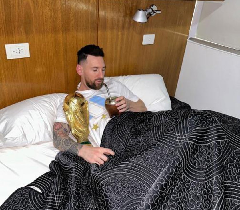 Звездата на Аржентина Лионел Меси спа със международната купа до себе си в леглото.