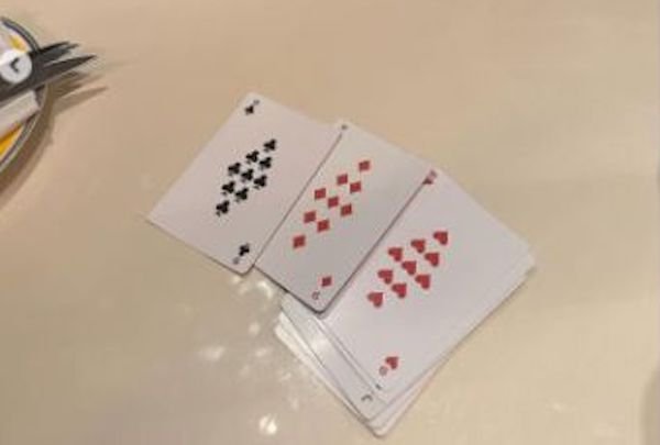 На нея се виждат три карти за игра на маса в забавна композиция - 9 спатия, 9 каро и 9 купа.