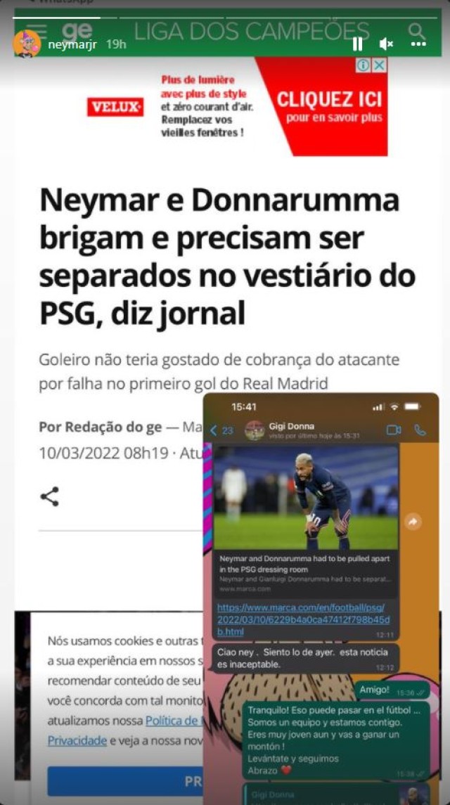 Звездата на " Пари Сен Жермен " Неймар се принуди да покаже персоналната си преписка със собствен съотборник Джанлуиджи Донарума, с цел да отхвърли слуховете, че двамата са се сбили в съблекалнята, откакто отборът им загуби от " Реал " Мадрид и отпадна от Шампионската лига на осминафинал.