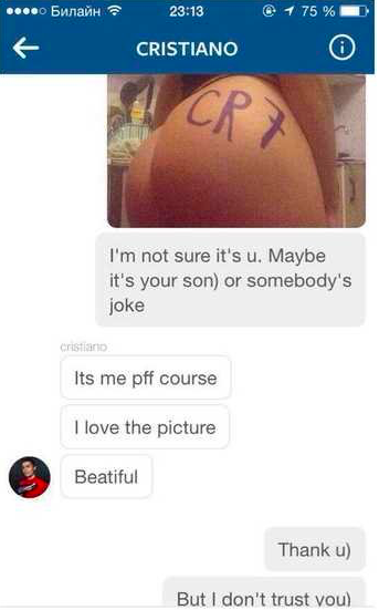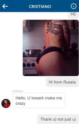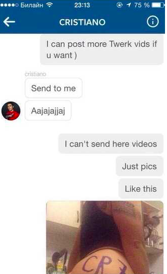 Звездата на Реал Мадрид Кристиано Роналдо се забърка в скандал в обществените мрежи, откакто стана ясно, че е желал от съветска танцьорка да му праща фотоси на дупето й. Португалският нападател е писал на Алена Александрова в „ Инстаграм “, че харесва фотография, която си е разгласила на задните елементи. След като тя му споделила, че може да качи още сходни обаче, той изискал да му ги изпрати непосредствено на него в известие. Алена изказала подозренията си, че може би си написа не със самия футболист, а с някой различен, само че с цел да й удостовери, че в действителност е той, Кристиано й дал номера си в Whats App, където най-вероятно чатът е траял.