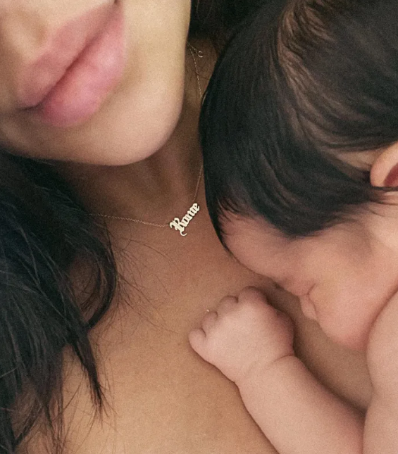 В сладкия кадър Мичъл е гушнала бебето до гърдите си. От фотографията се вижда още, че тя носи златно колие с името на бебето.