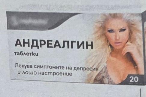 От Андреа произлизат хапчетата „ Андреалгин ". Тук почитателите са се постарали повече. Таблетките на Андреа 1 лекуват признаците на меланхолия и неприятно въодушевление, написа в описанието.