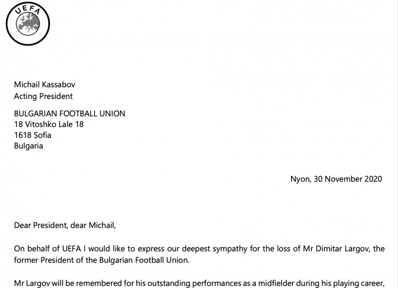 ...... той остана отдаден на футболната игра, за което сме му искрено благодарни. Моля да споделите съболезнованията ни с близките и роднините на Димитър Ларгов. Искрено Ваш, Александър Чеферин"